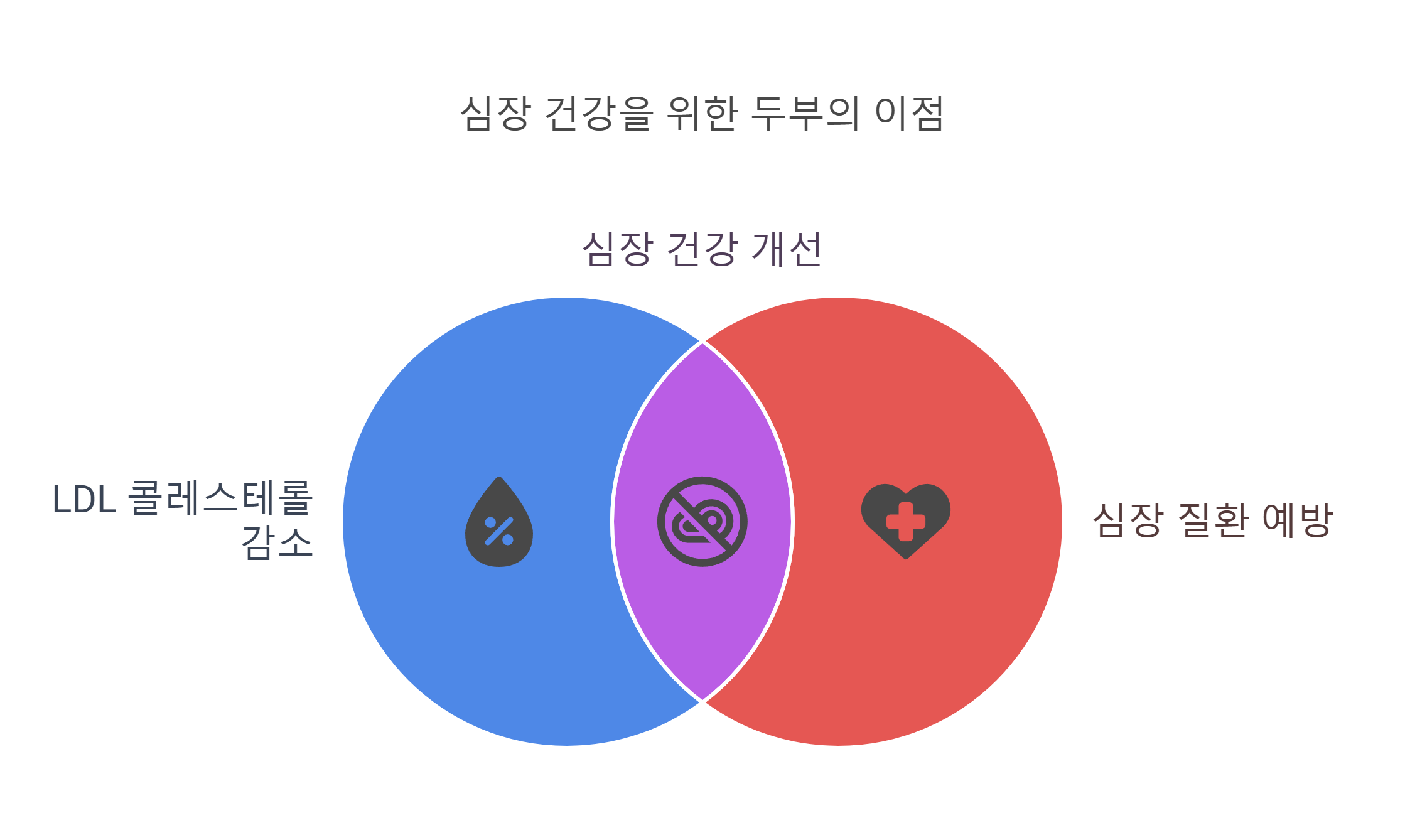 • 두부에는 나쁜 콜레스테롤(LDL) 수치를 낮추는 효과가 있어 고혈압과 심장 질환 예방에 도움을 줍니다.