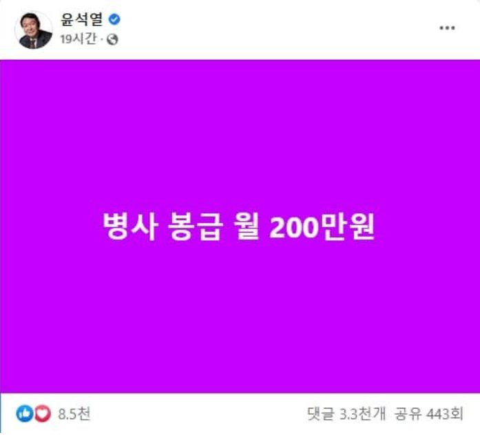 국민의 힘 대선후보 있을 때 공약 중에 하나였던 병사 월급 200만 원 은 1월 9일 윤석열 당선인의 페이스북에