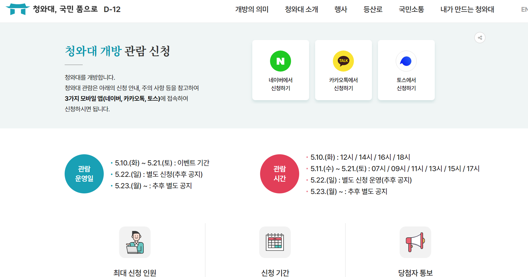 청와대 관람은 아래의 신청 안내, 주의 사항 등을 참고하여 3가지 모바일 앱(네이버, 카카오톡, 토스)에 접속하여 신청하시면 됩니다.