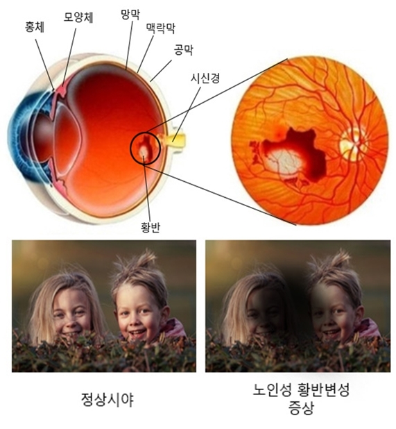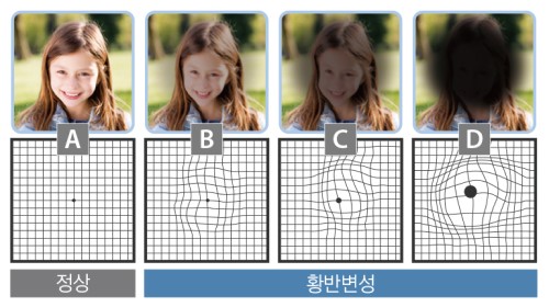 시야 가운데 부분이 흐릿한 영역으로 보이게되며 흐릿한 부분이 더우 커지고 검은 점이 보일 수도 있습니다.
